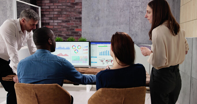 Business people, teamwork and meeting with data analytics of financial report, solution or collaboration. Accounting group, analyst or accountant talking of digital graphs, statistics or good results