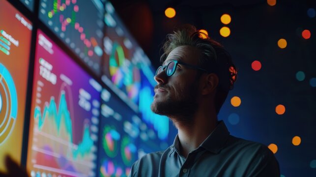 A young male data analyst observes colorful data analytics on multiple screens in a dark illuminated room.