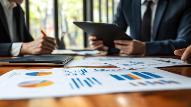 Data analysts sitting at boardroom with tablet and paperwork in hands and doing case study.