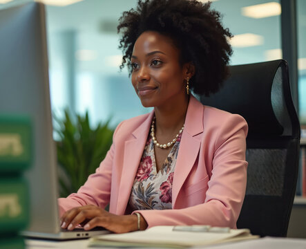 Black female accountant works on computer in office. CPA processes data at workplace. Smiling businesswoman in pink suit at desk during financial work.