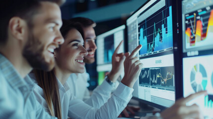 Business analysts use computers and dashboards for data business analysis and Data Management Systems with KPIs and metrics connected to the database for technology finance, operations, sales