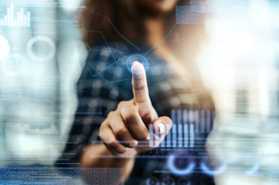 Hologram data, pointing and hand of woman on future dashboard, ui dashboard or stock market analytics. African investment chart, overlay and trader with holographic NFT, bitcoin or forex trading ai