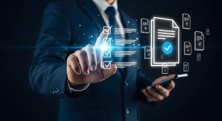 Man's hand interacting with a digital interface showing a bank symbol and checkmarks