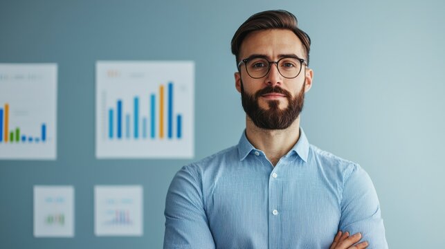 Confident businessman with glasses posing in an office, standing against a backdrop of analytical charts and graphs.