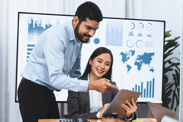 Multiracial analyst team use BI dashboard data to analyze financial report on meeting table. Group of diverse business people utilize data analysis by FIntech for success business marketing. Concord