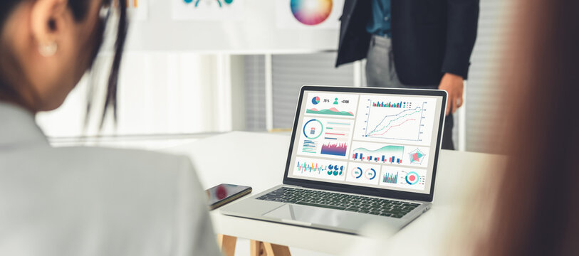 Focus BI power dashboard display on laptop screen with blurred background of analyst team analyzing business financial data using BI Fintech software for business insight. Panorama shot. Scrutinize