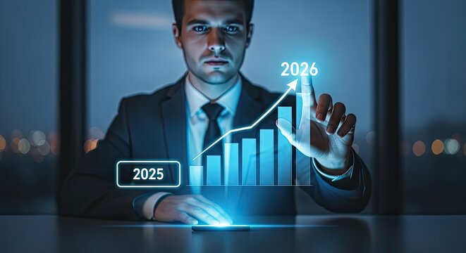 A determined businessman interacts with a futuristic digital interface, pointing towards projected growth on a holographic graph representing future years, the visual emphasizes innovation.