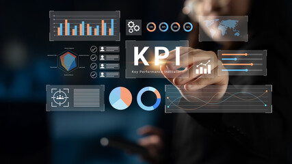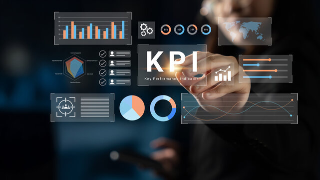 A business professional interacts with digital screens displaying key performance indicators and data visualizations, emphasizing modern analytics in a corporate setting. Gantry
