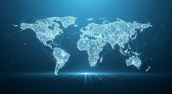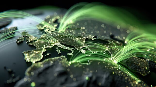 Abstract digital visualization showing interconnectedness and global networks with glowing lights and data streams