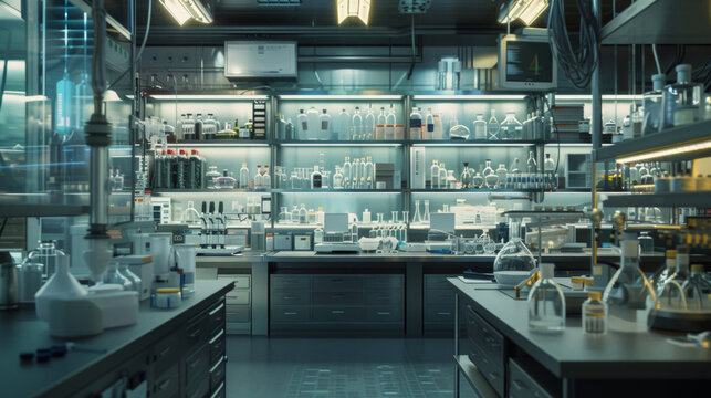 A sophisticated chemical research laboratory with fume hoods and analytical instruments, temporarily unoccupied but ready to discover new chemical compounds