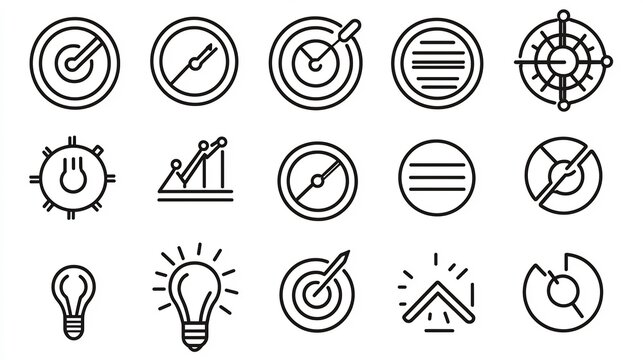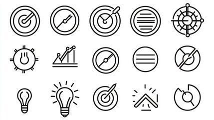 Comprehensive set of contemporary black and white outline icons covering various aspects of project management  workflow optimization  process improvement  and target achievement strategies