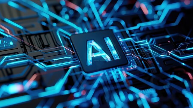 Abstract AI Logo with Glowing Blue Digital Circuit Background, Futuristic Artificial Intelligence and Machine Learning Technology Concept in Cyberspace, 3D Rendering Close-Up View.