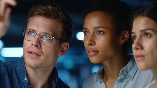 Three young scientists collaborate in a modern laboratory while analyzing samples and data