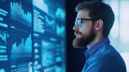 A focused professional analyzes data trends on a digital screen filled with graphs and statistics, emphasizing analytical skills and technology.