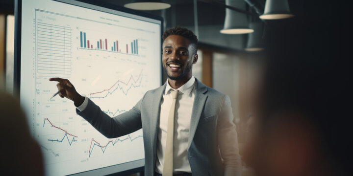 African American man. Beautiful young business executive person is doing speech of analyzing strategy