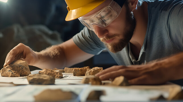 Mining engineer evaluating drill core samples in a field lab. Featuring analytical skills and resource analysis