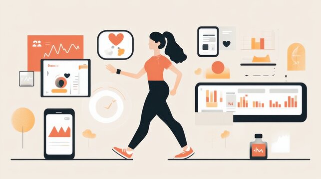 Woman jogging while interacting with health and fitness data on various digital devices