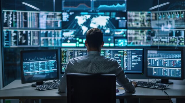 Businessman holds data-driven tech insights. Modern digital graphs, numbers float in hands. Informed business strategies, data management. Tech, analytics concepts. Decision making process presented