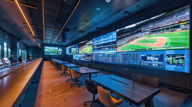 high-tech sports analytics center where coaches and players review performance data on large interactive screens, optimizing strategies in real-time