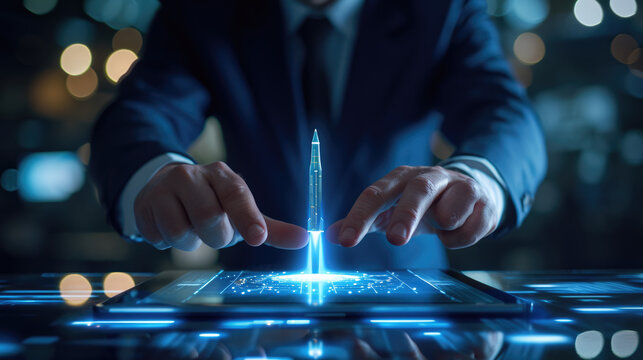 Man's hands interacting with a futuristic holographic display, projecting a rocket launch