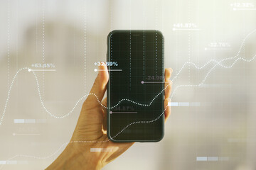 Multi exposure of creative statistics data hologram and hand with cell phone on background, stats and analytics concept