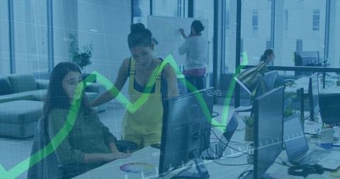 Businesswomen collaborating on data analysis in modern office with neon analytics graph