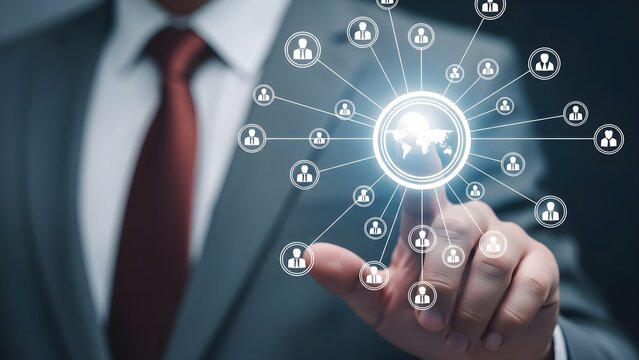 Close-up of a businessman in a suit interacting with a glowing network diagram on his fingertip with a dark background.