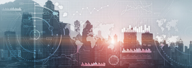 Business intelligence control interface marketing finance management city skyline view website panoramic header banner. Mixed Meida