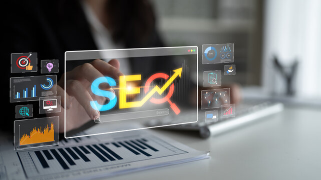 SEO concept for improving SEO visibility, with SEO related digital tools and SEO performance icons shown in an focused layout for strategic marketing. Spline