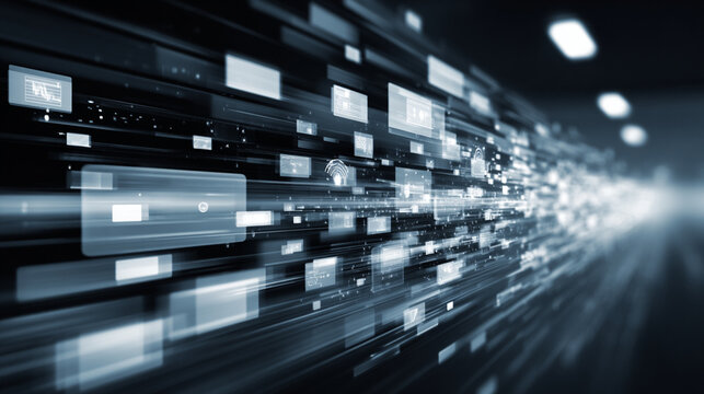 Holographic data dashboard wall extending forward with analytics charts and light flares