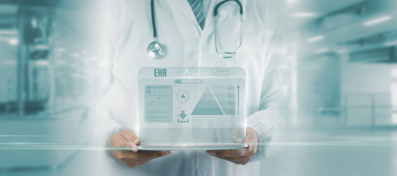 Futuristic healthcare concept showing doctor holding digital tablet with  holographic EHR interface, visualizing electronic medical records and patient analytics in smart hospital environment.