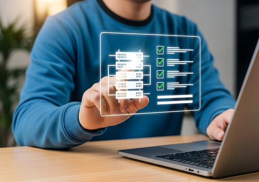 Adult male interacting with futuristic holographic interface and data analytics hud