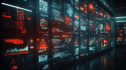A wall of digital screens with glowing red and blue data.