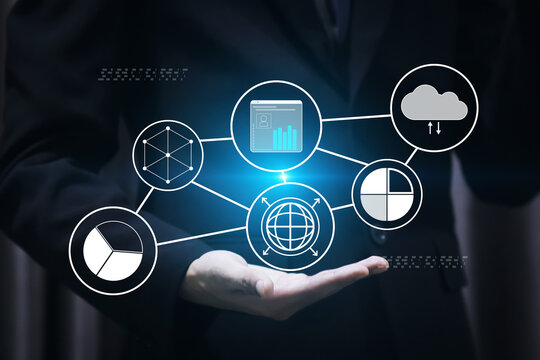 AI cloud computing and data analytics concept. Businessman touching virtual globe with cloud AI icon, graphs, charts, and digital interface for big data processing and innovation technology.