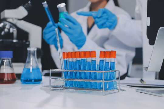 Biologists woman do experiments in biological laboratories. Generative AI.