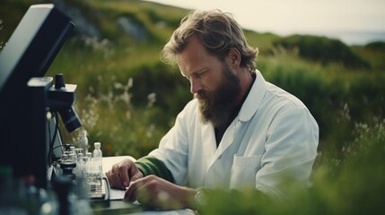 Portrait of a male scientist at a remote research station studying ecosystems and biodiversity