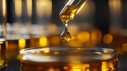 Droplet of liquid falling from a pipette into a beaker in a laboratory setting, illuminated by warm lighting in the background