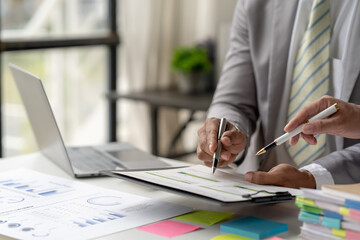 Group of business people meeting to plan, think, analyze, point to graph and business growth to plan new business expansion in the future using a laptop and a calculator.
