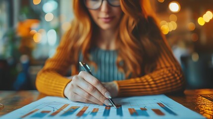 Woman analyzing financial data on a chart. Businesswoman in glasses working on financial report in a cozy cafe environment.