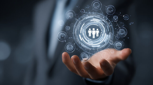 Businessman in a suit pointing at a futuristic digital interface focused on business lead generation.
