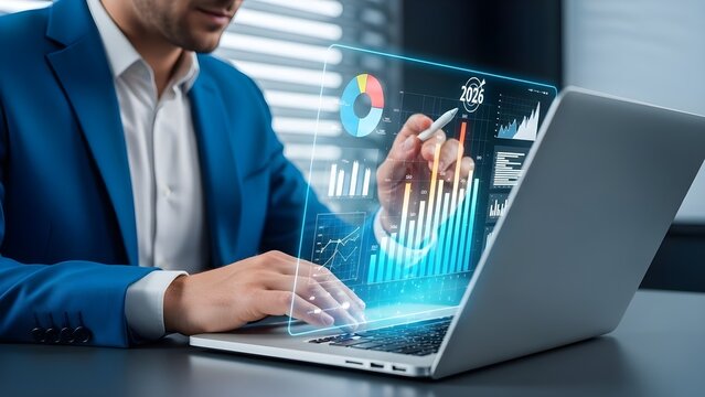 Businessman analyzing complex data on a futuristic holographic laptop display.
