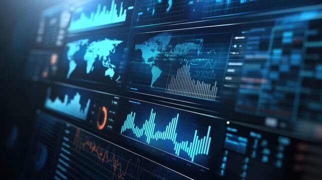 Futuristic Data Visualization Interface with Global Maps and Graphs Showcasing Analytics and Performance Metrics in a Modern Digital Environment