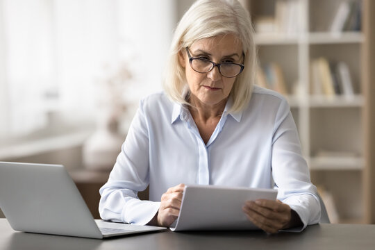 Older businesswoman wearing glasses reading document seated at desk with laptop examining content of agreement carefully, reviewing financial statement, analyzing important papers related to her work