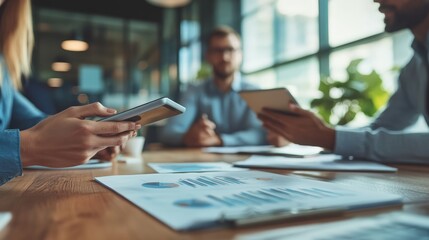 Hands holding digital tablets during a business meeting with charts on the table. Data analysis and technology integration.