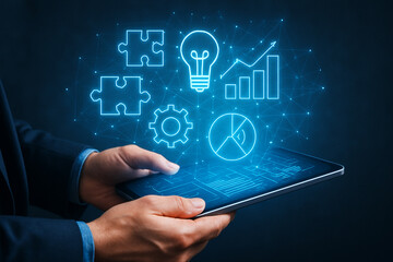 Hands holding tablet with glowing icons of puzzle pieces lightbulb chart and gear above it on dark background