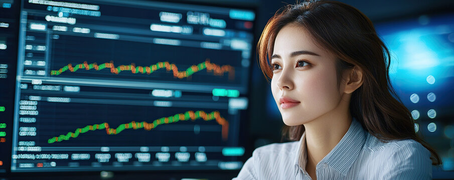 Focused woman analyzing stock market data on multiple screens, showcasing real time charts and financial trends