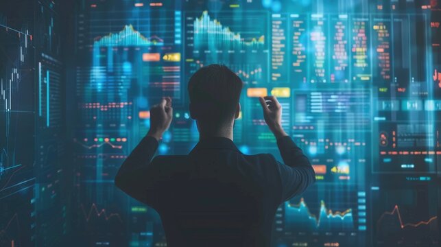 Woman analyzing financial data on high-tech screens symbolizing modern finance, stock trading, AI integration and global economic trends