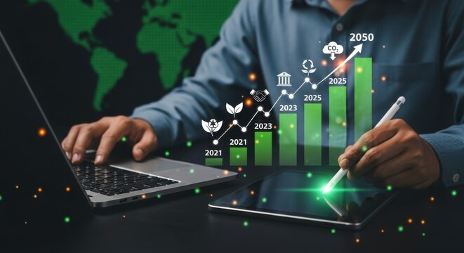 Global financial data visualization with neon green trend line over teal wireframe globe