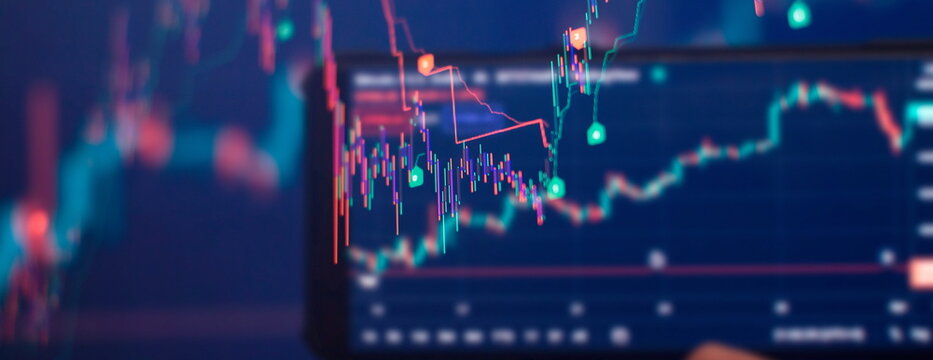Business statistics and Analytics value . Abstract glowing forex chart interface background. Investment, trade, stock, finance and analysis concept.
