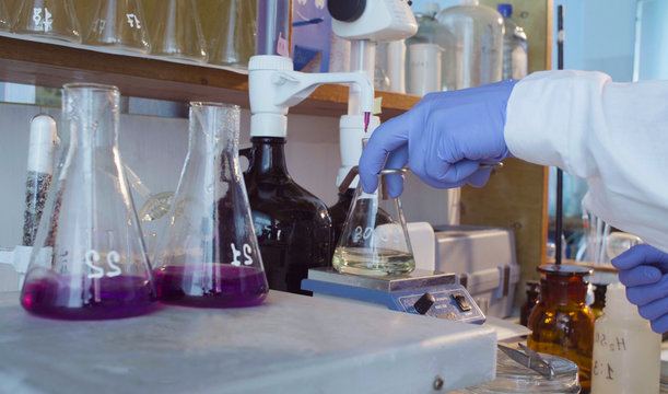 Gloved scientist pours yellow oily liquid from flask into test tube.